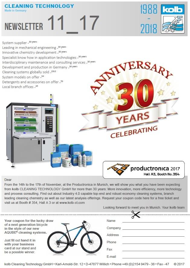 Kolb Cleaning Technology, the international full-service provider of cleaning systems, cleaning chemicals, technology and process design will celebrate there 30 years anniversary on Productronica. Look to the picture for more details. Contact Smans NV for more details, tickets and appointments!